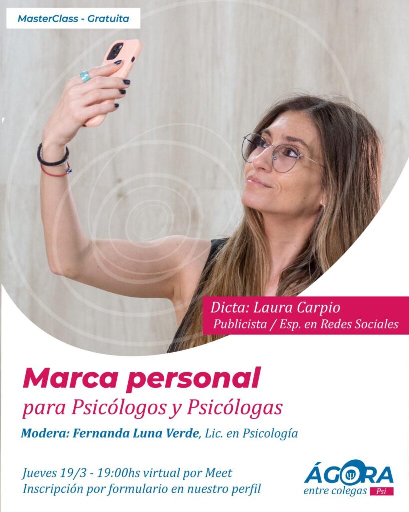 Desde ÁGORA entre colegas Psi invitamos a colegas de toda la provincia a participar de la MasterClass gratuita “Marca personal para Psicólogos y Psicólogas”, un encuentro virtual pensado para reflexionar sobre la construcción de la identidad profesional en entornos digitales y el lugar que hoy ocupan las redes sociales en el ejercicio de la profesión.